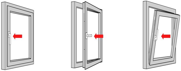 Самая распространённая операция при пользовании окном и дверью – открывание и закрывание/запирание. Современная фурнитура даёт несколько вариантов открывания с помощью поворота оконной ручки: |